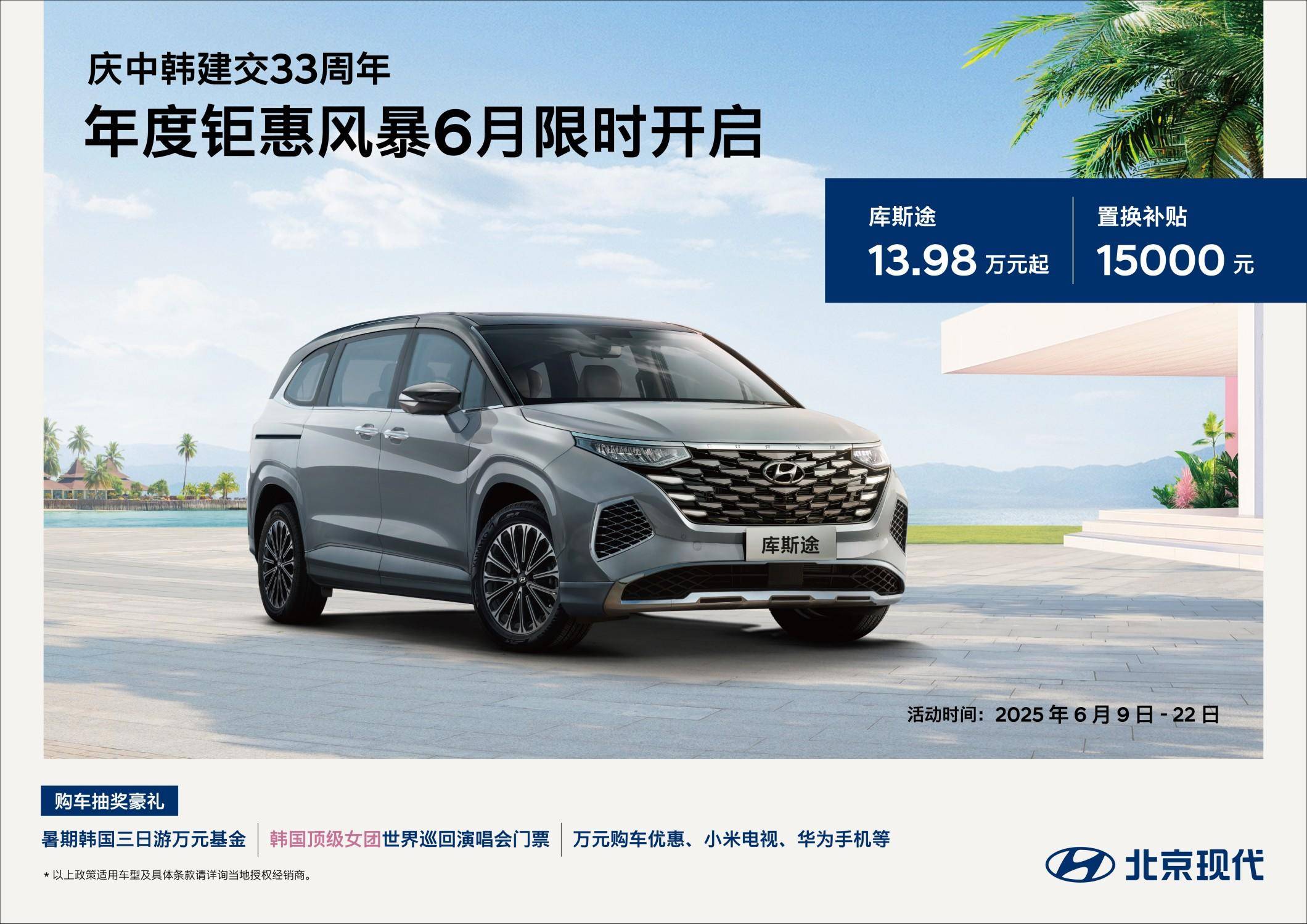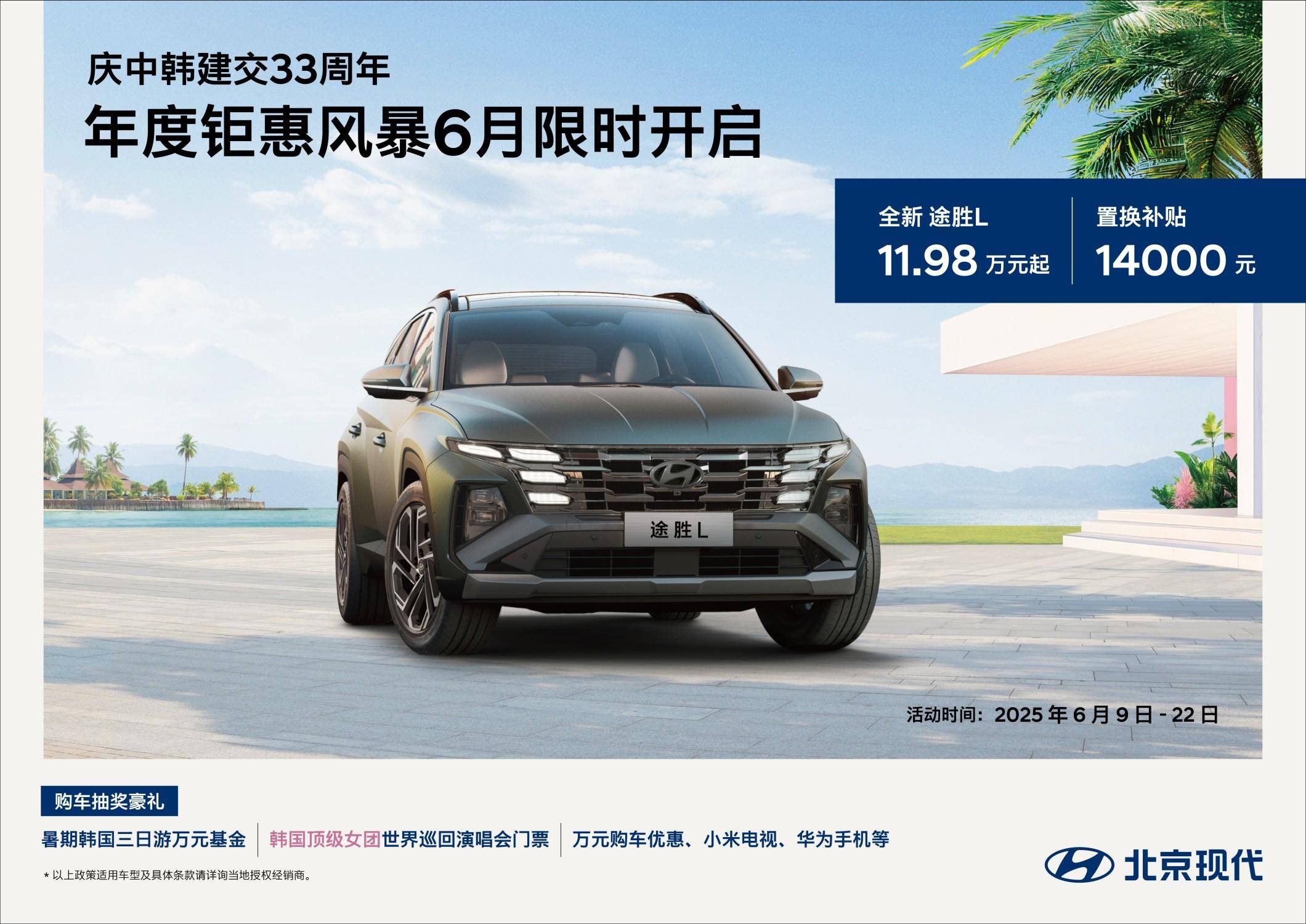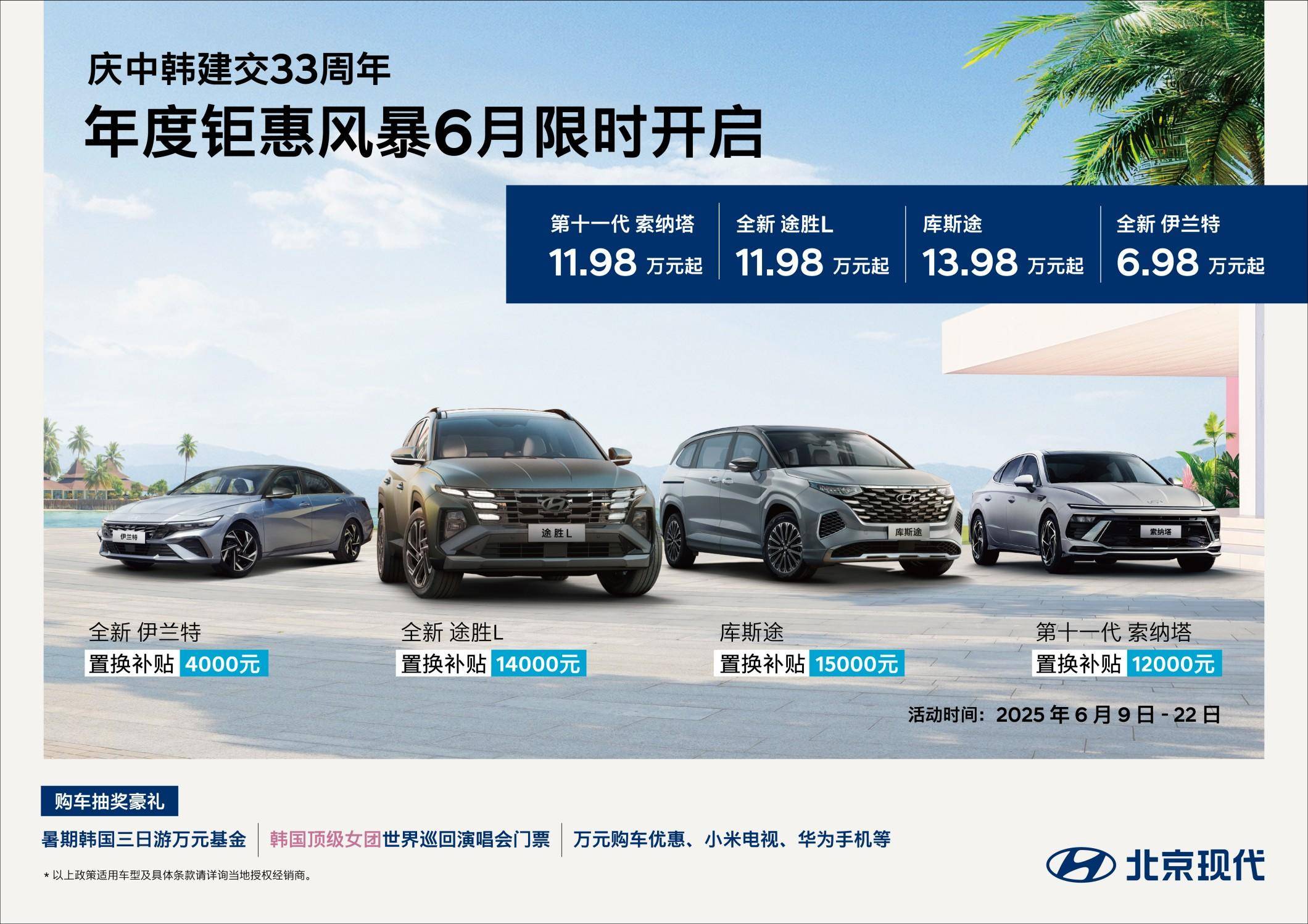 这次北京现代 618 福利超丰厚!6 月 11 日 - 30 日购车,开出发票就能抽 100 张 BLACKPINK 香港演唱会门票或 300 份韩国三日游基金;6 月 9 日 - 22 日花 1.88 元意向金,每售 10 台抽 75 寸小米电视,100 台抽华为手机,1000 台抽万元油卡和购置税保险礼包 。置换也有惊喜,6 月 1 日 - 30 日,库斯途补贴 15000 元、途胜 L 补贴 14000 元、索纳塔补贴 12000 元,伊兰特补贴4000元,怎么算都巨划算,买车趁现在!