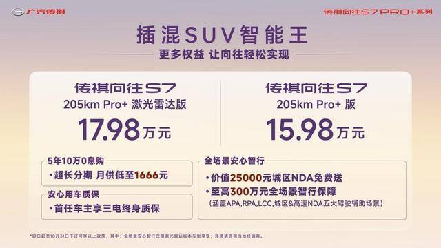 同时,传祺向往S7全新Pro+系列售价15.98万元起,更带来传祺史上最给力的金融政策:5年10万0息,月供低至1666元,还有价值25000元城区NDA免费送、至高300万元全场景智行保障,首任车主还可享三电终身质保,真正让“向往的生活”触手可及。