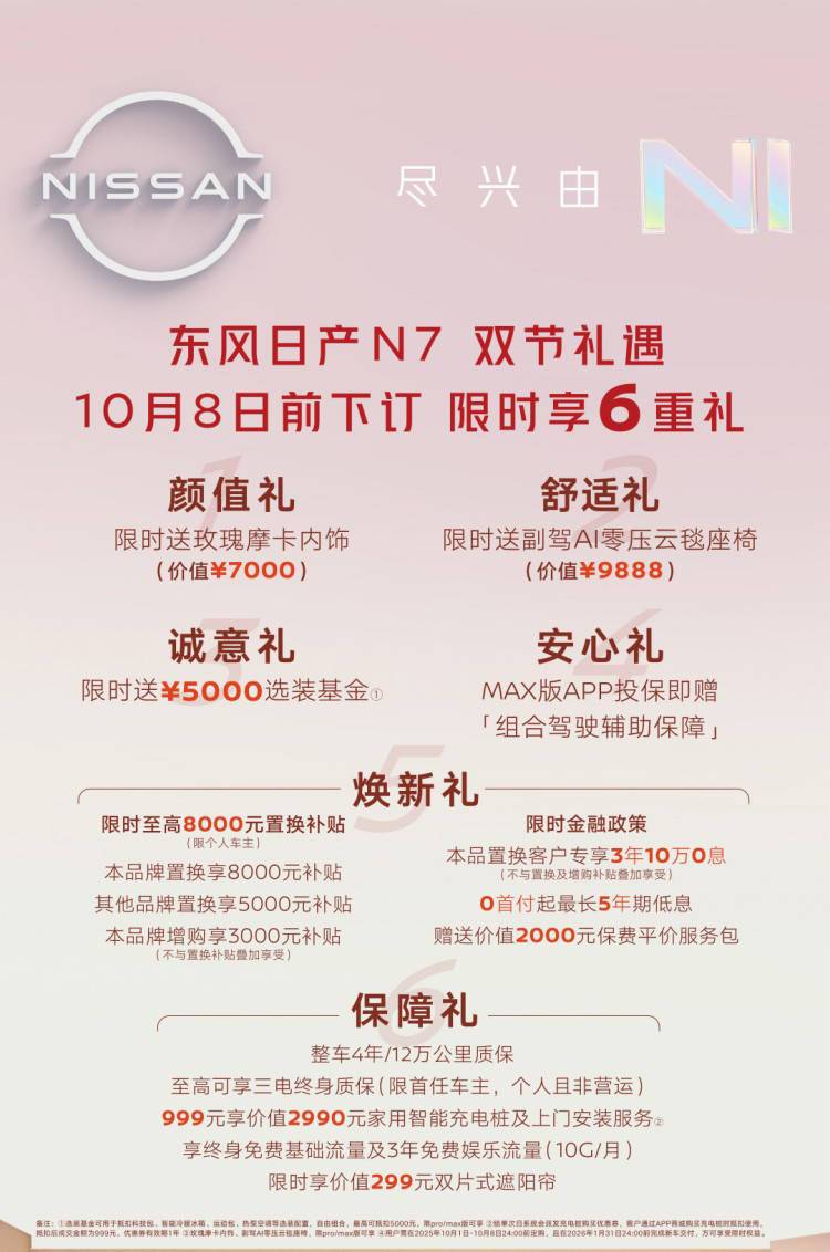 10月8日前,东风日产为选购N7的用户推出专属购车礼遇,涵盖配置升级、金融政策、用车保障等多重权益。