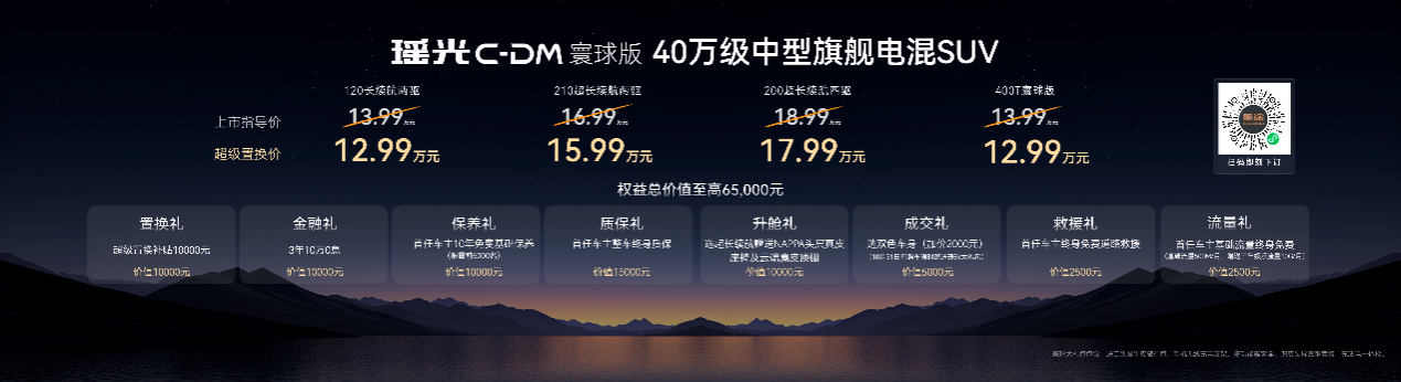 本次上市共有瑶光C-DM寰球版120长续航两驱、210超长续航两驱、200超长续航四驱 3款配置版型,指导价分别为13.99万元、16.99万元、18.99万元。新车以40万级豪华品质、40万级豪华安全、40万级豪华性能三大核心优势,重新定义40万级旗舰电混SUV价值标准。同时,星途还为青睐燃油车的消费者提供了燃油版车型瑶光400T寰球版,指导价13.99万元。