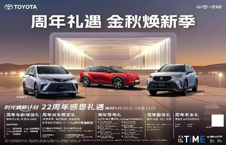 9月是一汽丰田的生日月,22年前,一汽丰田拔锚启航,开启了壮阔的发展篇章。22年间,一汽丰田累计赢得1200万用户的信赖,积累了今天应对产业变革的巨大资产;9月自然也就成了一汽丰田的“客户回馈月”。