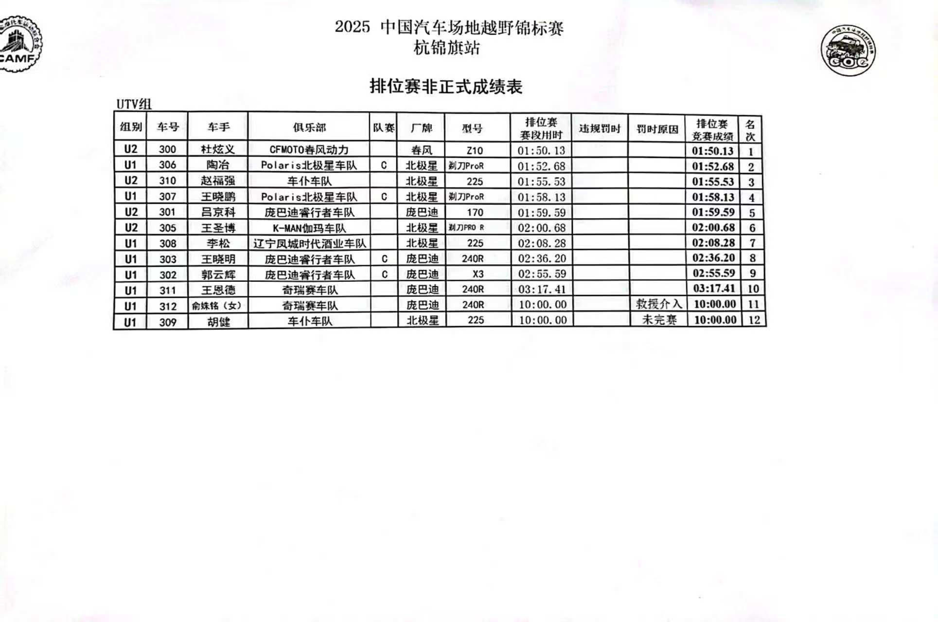 在UTV组,庞巴迪睿行者车队的王晓明以稳定和冲刺能力见长,长期活跃在全国场地越野赛场;Polaris北极星车队陶冶则以硬朗的驾驶风格和娴熟的操控技巧著称;杜炫义代表CFMOTO春风动力出战,作为Z10车型的代表车手,他在厂商背书和个人实力的双重加持下,是本站夺冠的热门人选。
