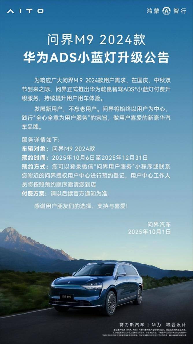近期,为响应广大问界M9(参数|询价) 2024款用户的需求,问界汽车正式为问界M9 2024款用户推出华为ADS小蓝灯付费升级服务,持续提升用户用车体验。