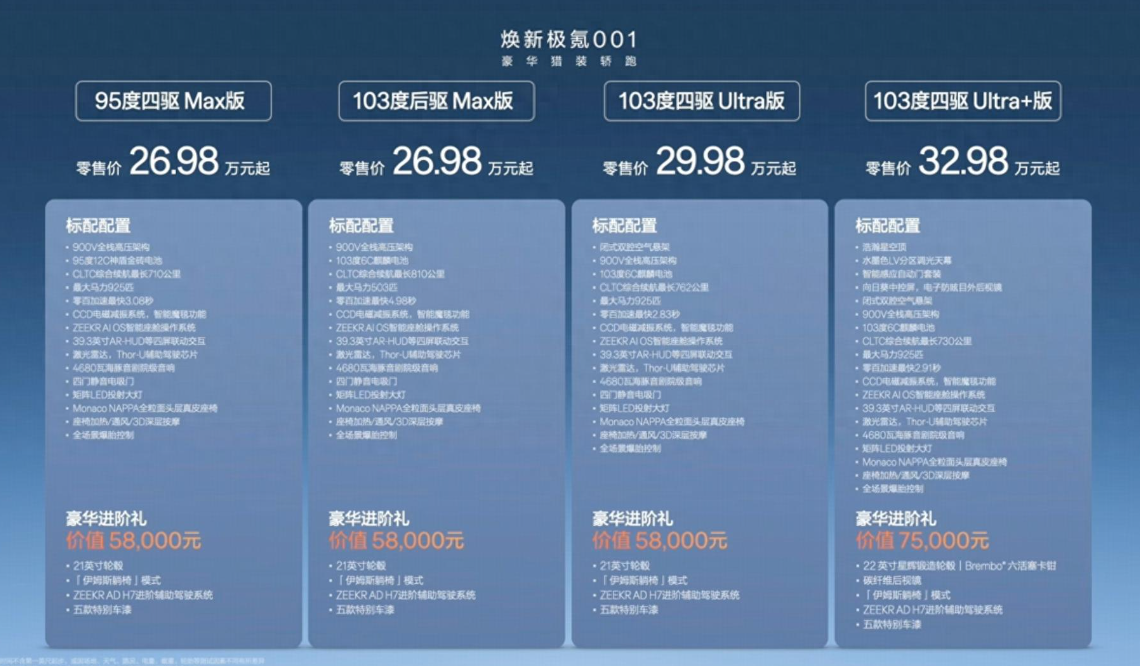 10月11日,新款极氪001正式上市,售价:26.98万元-32.98万元,超级置换权益后限时售价:25.98万元-31.98万元。