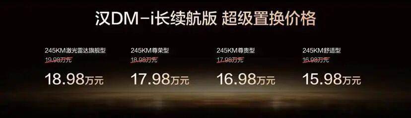 此次,汉DM-i长续航版共推出4款车型,补贴后售价15.98万~18.98万元;汉EV长续航版共推出3款车型,补贴后售价17.38万~20.58万元(10月31日前完成购车可享1万元超级置换补贴)。同时,比亚迪还为用户准备了包含置换补贴在内的至高价值3.8万元七大礼遇。