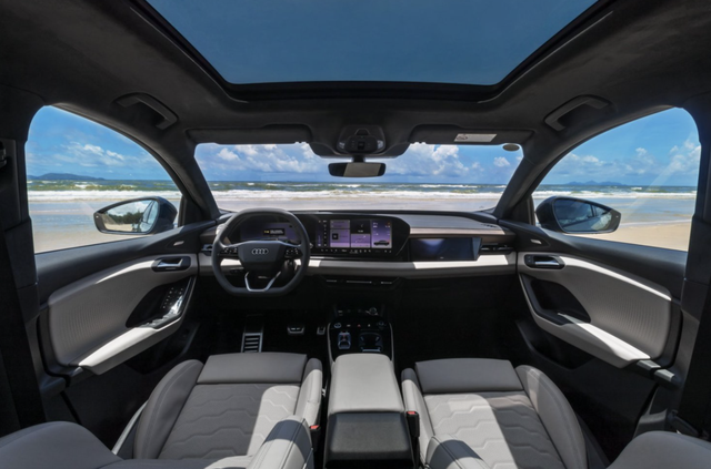 来吧,尊贵的奥迪车主,请您上车!咱们再聊聊一汽奥迪Q6L e-tron这个大宝贝的内饰,坐进车内,谁都会说上一句:这车真是奥迪,很科技,很豪华!以驾驶员为中心的双OLED 曲面屏给你 IMAX 级巨幕体验,外加10.9英寸的副驾娱乐屏,可以飞屏分享,与手机深度交互,语音识别又快又准,还配备了88英寸全息视界 AR-HUD,这未来感十足的座舱设计让新势力怎么追?用PPT追吗?