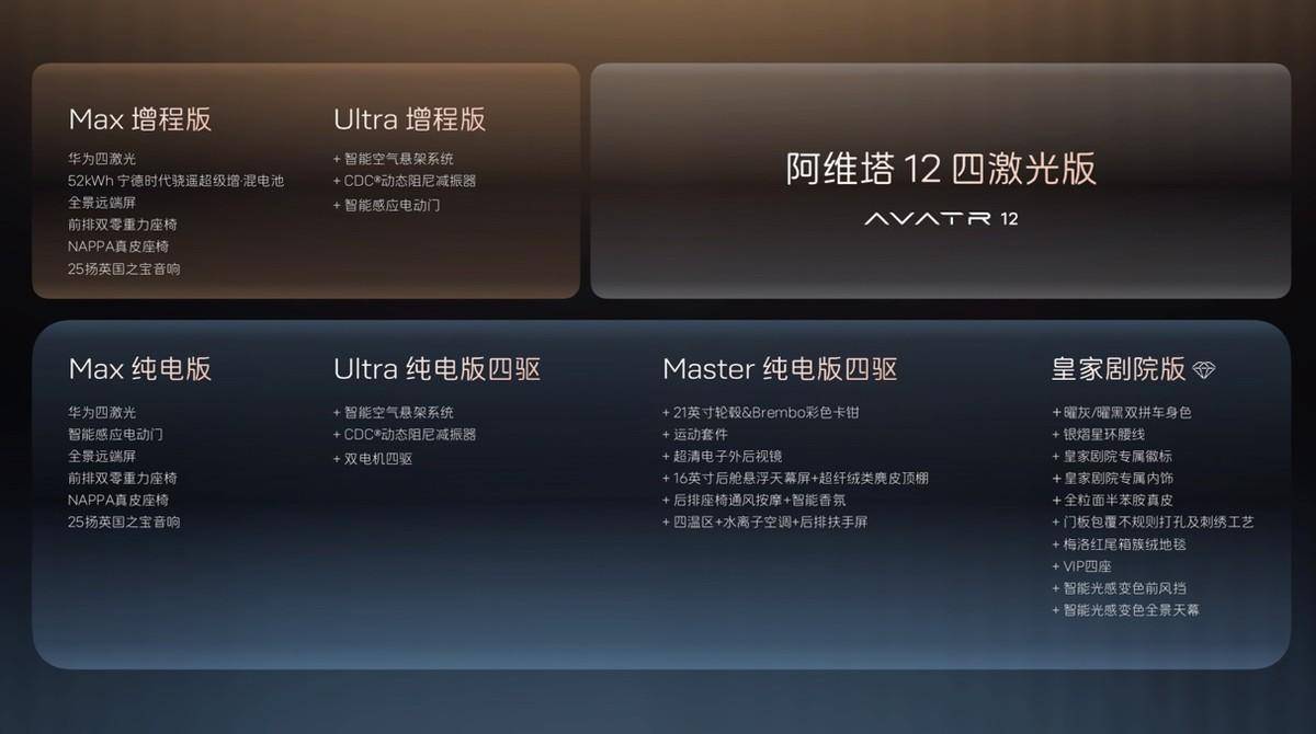 2025年10月18日(重庆),阿维塔12 四激光版预售发布会在重庆旁观者设计博物馆举办,并宣布阿维塔*华为乾崑智驾®城市公开赛即将启动。阿维塔12 四激光版提供纯电与增程双动力,共推出6款车型。即日起至上市前下订,即可享2000元意向金抵扣5000元购车款的限时预售权益。