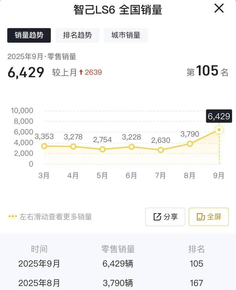 从销量走势来看,智己LS6在2025年前8个月的月均销量约为3000辆,处于稳步爬坡阶段。9月销量跃升至6429辆,较8月的3790辆增长2639辆,增幅显著。但需要注意的是,该车于9月10日正式上市并同步开启交付,9月实际销售周期仅20天。