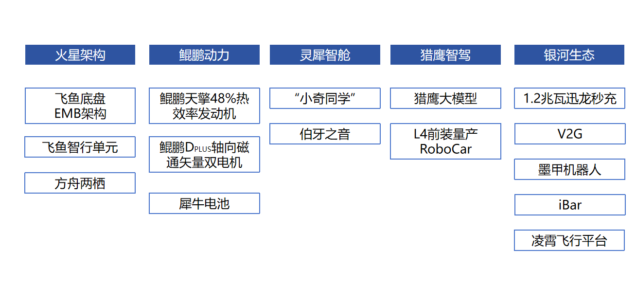 技术分享围绕五大板块展开,分别是火星架构、鲲鹏动力、灵犀智舱、猎鹰智驾、银河生态。这五大板块之下,又有很多不明觉厉的“新词儿”,为了方便呈现,干脆整理成一张图,如下:
