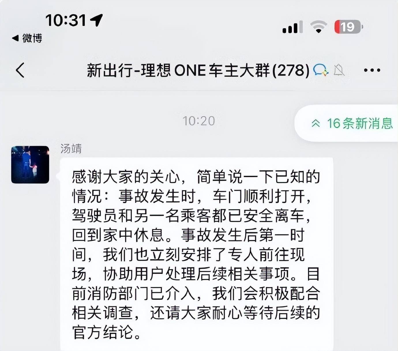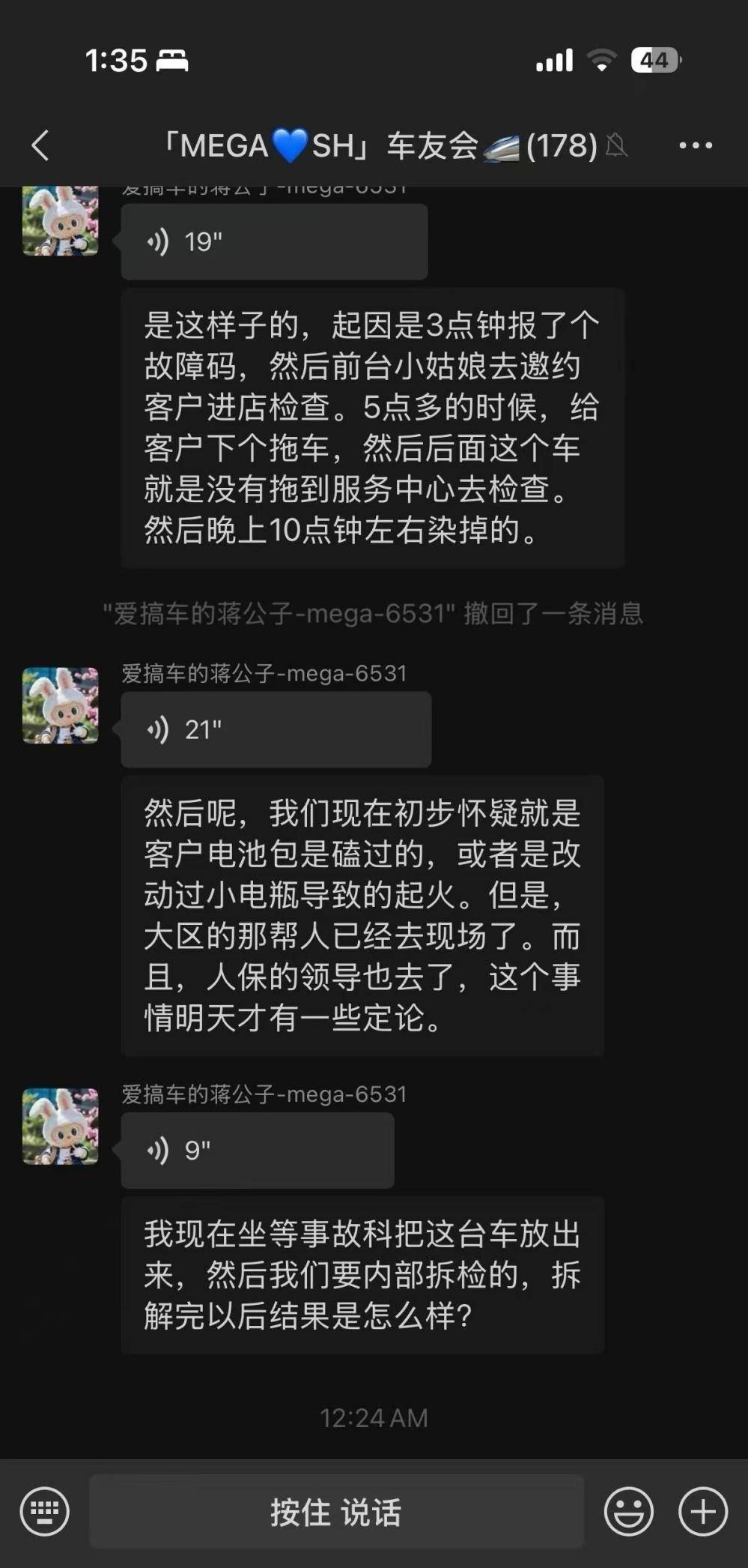 10 月 24 日午后,网络上开始有传言发酵,根据网络上流出的聊天记录显示,涉事车辆当日下午 3 时曾报蓄电池故障码,车主未及时检修导致起火,相关说法迅速引发对车主责任的讨论。