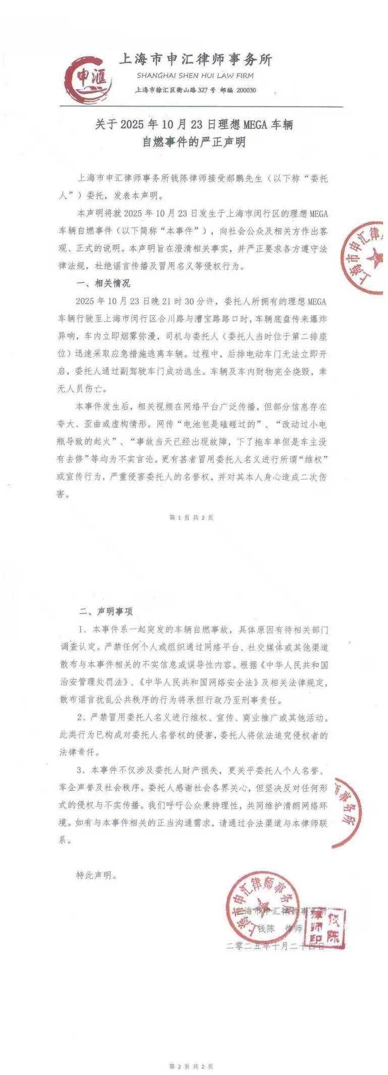 10 月 24 日 16 时起,车主开始正式反击,委托上海市申汇律师事务所接连发布声明与补充说明,澄清逃生细节、驳斥传言。