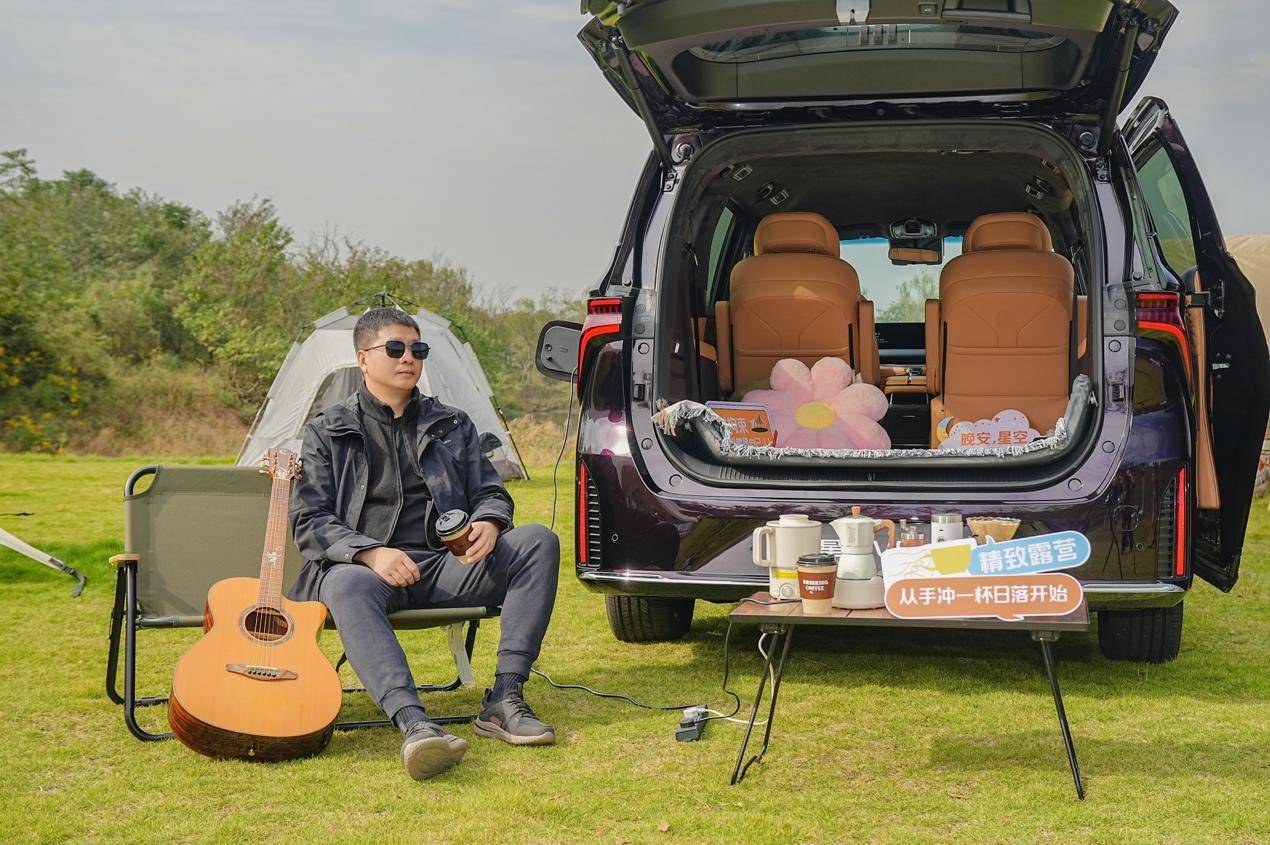 在亲子露营区,全车42处人性化储物空间,轻松收纳所有玩具与零食;在旅居露营区,同级唯一的第三排座椅可下沉式完全放平,带来了1.8米大平层,可躺可卧;而在野奢与轰趴露营区,强大的6kW外放电功能更是大放异彩,同时驱动咖啡机、电火锅、投影仪等多种电器,将荒野瞬间变成星空影院。专门改装的星海V9升顶露营车,车内配备冰箱、沙发、小床、小桌板和操作台,户外露营装备一应俱全,堪称“露营大房车”。