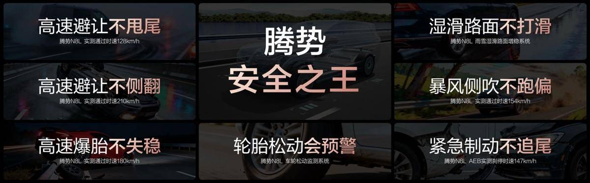 主动安全方面,得益于易三方,腾势N8L能够以128km/h高速避让不甩尾、210km/h高速避让(鱼钩测试)不侧翻、180km/h高速爆胎不失稳、154km/h暴风侧吹不跑偏、147km/h AEB自动紧急制动、不怕雨雪路面打滑、车轮松动监测系统,以科技安全守护家人出行安心。腾势汽车不愧被称为新能源汽车的“安全之王”。
