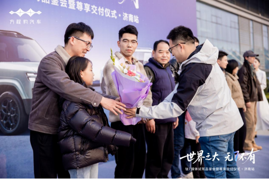 在主持人充满温情的引导下,全场嘉宾缓缓转至精心布置的交车区域。在热烈的掌声与期待的目光中,首批车主代表依次登台,接过满载祝福的鲜花与专属定制礼盒,这不仅展现了方程豹对每一位用户的尊重与重视,更表达了品牌对品质与服务的承诺。每一次交接,不仅是一次产品的交付,更是一份信任的传递与美好生活的启航。