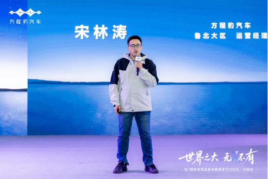 在随后的发布环节,方程豹汽车鲁北大区运营经理宋林涛先生登台致辞,深刻阐述了钛7的产品定位与品牌思考;他表示:“钛7不仅是一款新车,更是方程豹对自由、个性与品质家庭生活理解的真诚回应,它将助力用户轻松实现从城市日常到户外探索的多场景无缝切换,真正拥抱‘世界之大,无7不有’的精彩生活。”