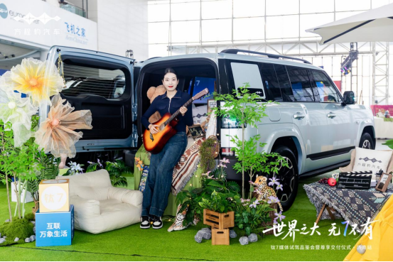 步入展车区,露营风格的尾箱布置让嘉宾沉浸于轻松惬意的户外氛围。钛7在绿意点缀下,硬朗外观与自然格调相得益彰。露营尾箱空间不仅直观展现近千升后备箱的宽敞与规整,也生动诠释了“移动生活空间”的理念。