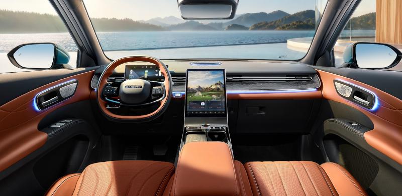新车全系标配10.25英寸全液晶仪表屏,“豹款”采用13.2英寸竖立式大屏,并同时保留部分实体按键与旋钮,中控鞍座布置50W风冷单槽无线充电面板和双杯座。“虎款”搭载15.6英寸悬浮式中控大屏,实体按键被大幅削减,中控鞍座布置有双手机槽和50W风冷单槽无线充电面板,双杯座和驾驶模式控制旋钮被布置于其后方。