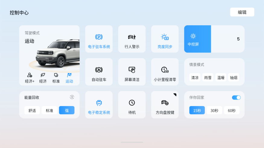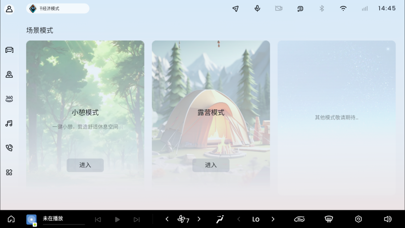 • 露营模式:开启后车辆可长时间维持通电状态,空调、音响、灯光系统持续工作(适用于:野外露营、车内观影等)。