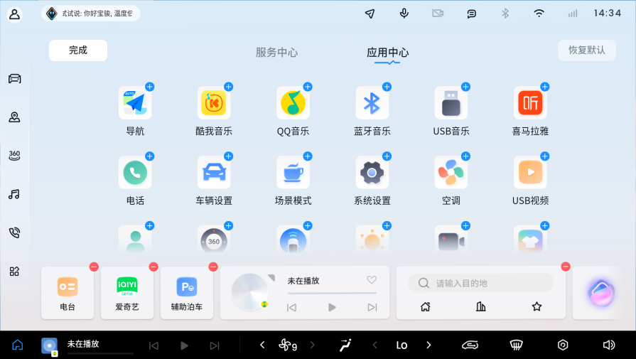 • 新增懒人听书、QQ音乐、爱奇艺高频使用的热门应用,无论是在线音乐、有声读物还是影音娱乐,都能在车内便捷享受,满足驾乘途中多样化的娱乐需求,让每一次出行都充满乐趣。