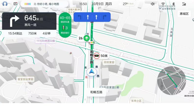 • 新增红绿灯读秒与绿波引导:显示红/绿灯剩余时间及通行状态,更精准地预判路口通行时间。同时绿波引导可在符合条件的路段获得绿波车速建议,保持一定车速可以通过红绿灯,提升通行效率。