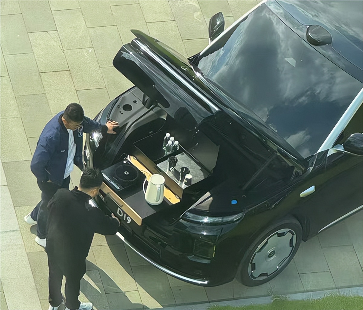 零跑D19的前备舱采用L型立体布局,在传统储物空间基础上深度优化,容积较同级车型提升30%以上。其核心创新在于内置220V交流电源接口,支持咖啡机、电磁炉、烧水壶等家用电器直接使用,配合隐藏式排水通道,可轻松实现“煮茶、炒菜、涮火锅”等烹饪场景。