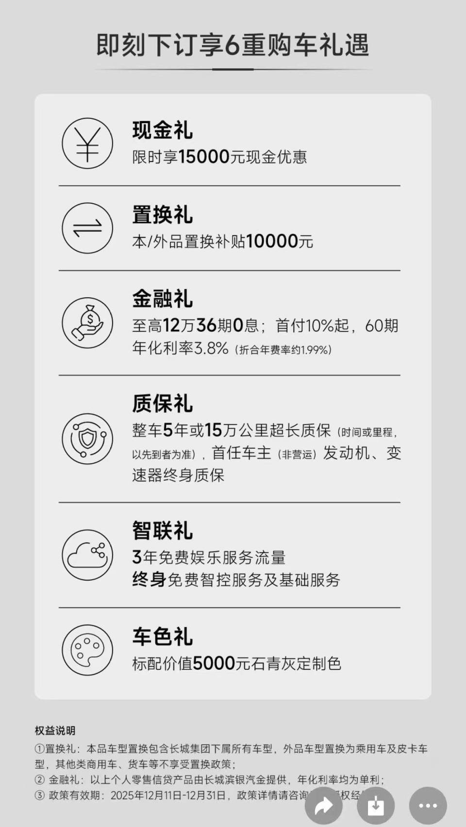 即日起至12月31日,用户下单可享受15000元现金优惠、10000元置换补贴。金融政策方面提供至高12万36期0息,或首付10%起、60期年化利率3.8%的灵活选择。质保政策颇具诚意:整车享受5年或15万公里超长质保,首任非营运车主还可享受发动机、变速器终身质保。
