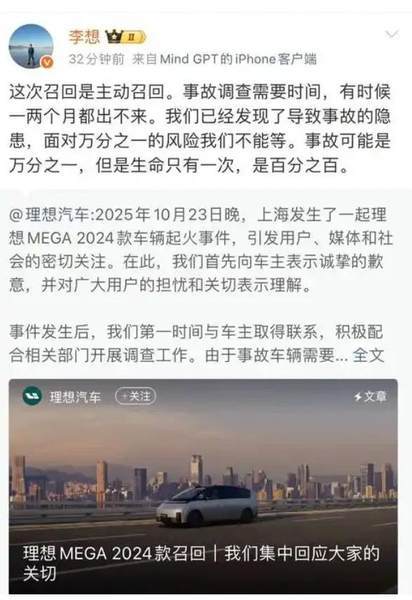 我们再来说回到理想MEGA上,在10月底,一辆行驶中的理想MEGA突发自燃,短短10秒内整车便被火势吞噬,万幸的是驾驶员及乘客逃出生天,随后理想在8天后立即宣布召回1.14万辆2024款MEGA,将事故原因归结为批次冷却液防腐性能不足,可能腐蚀冷却铝板引发电池热失控,但此次召回的本质是返厂更换动力电池、前电机控制器等核心硬件,而非简单的软件升级,这一处理方式反而放大了用户对理想汽车产品的品控质疑。