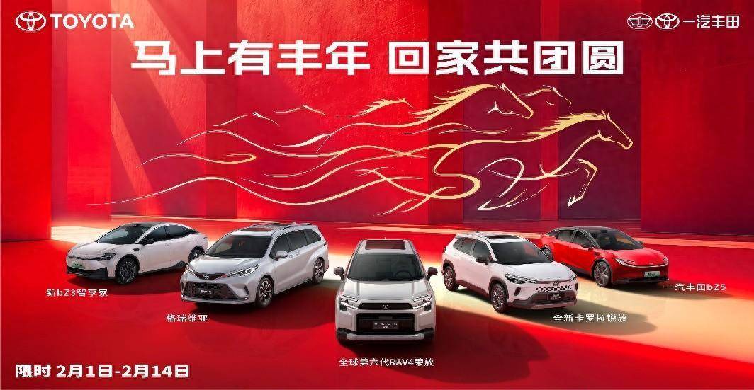 年味渐浓,归途可期。一汽丰田以一份诚挚礼遇,守护每个家庭的团圆之旅。2月1日至2月14日,一汽丰田推出限时活动,皇冠陆放(参数|询价)、格瑞维亚(参数|询价)等明星车型享至高20000元的置换补贴;全新第六代荣放限时焕新价15.18万元起,并可享4000元的购置税补贴和6000元的双保无忧礼;纯电“双子星”bZ3智享家和bZ5至高享4000元购车补贴和“三电终身质保”“电池三兜底”的服务权益;全新智混卡罗拉、全新卡罗拉锐放也可享4000元新春购置税补贴。