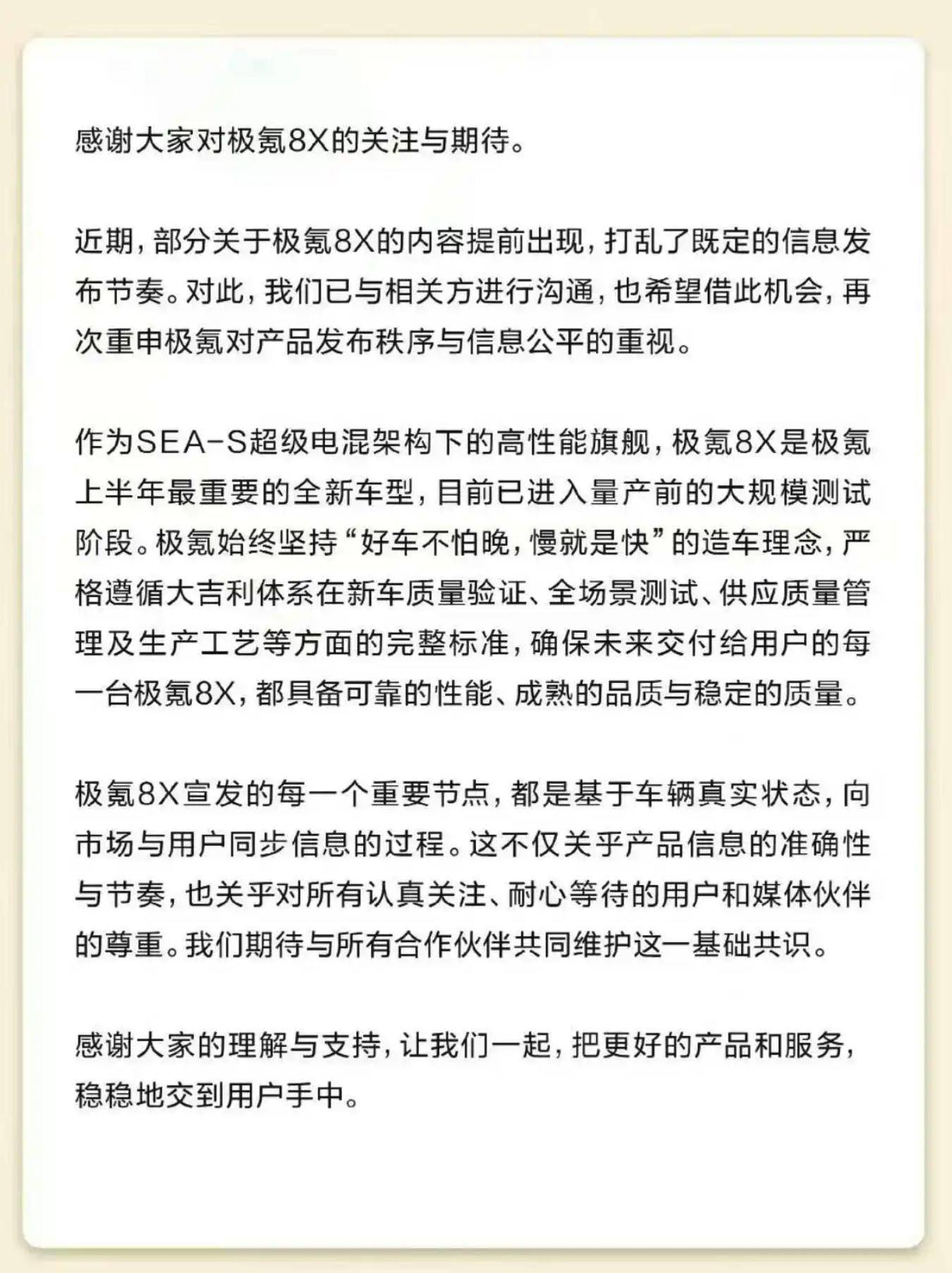 对于极氪而言,8X不仅仅是一辆新车,更是其定义“2026年上半年最重要一战”的核心筹码。官方虽打出“尊重用户等待”的情怀牌,并重申将依托“大吉利体系”确保量产前的品质测试,但字里行间难掩对叙事节奏被打乱的焦虑。