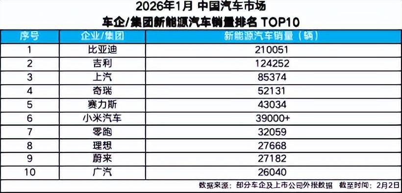 新年伊始,中国新能源汽车市场的竞争轮廓迅速显现,头部车企之间的差距在1月销量榜单中被进一步拉开。截至2月2日,根据部分车企及上市公司对外披露的数据,比亚迪以超21万辆的新能源汽车销量位居行业首位,展现出极具强大的市场竞争力,继续稳居中国新能源市场头部位置,并在主要车企中拉开明显差距。