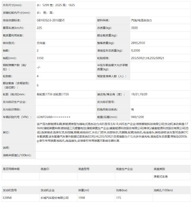 动力部分,魏牌V9X将搭载一套2.0T插混系统并运用800V高压架构+Hi4电混四驱系统。其2.0T混动专用发动机最大功率输出175kW,满电状态0-100kph加速成绩4.4秒,亏电状态下0-100kph加速成绩4.7秒,极速210kph,动力性能强劲。得益于800V高压架构以及所搭载的53.6kWh和77.7kWh两种容量的6C电池,魏牌V9X的CLTC工况纯电续航分别有240公里和363公里两种版本,充电5分钟即可补充200公里纯电续航。