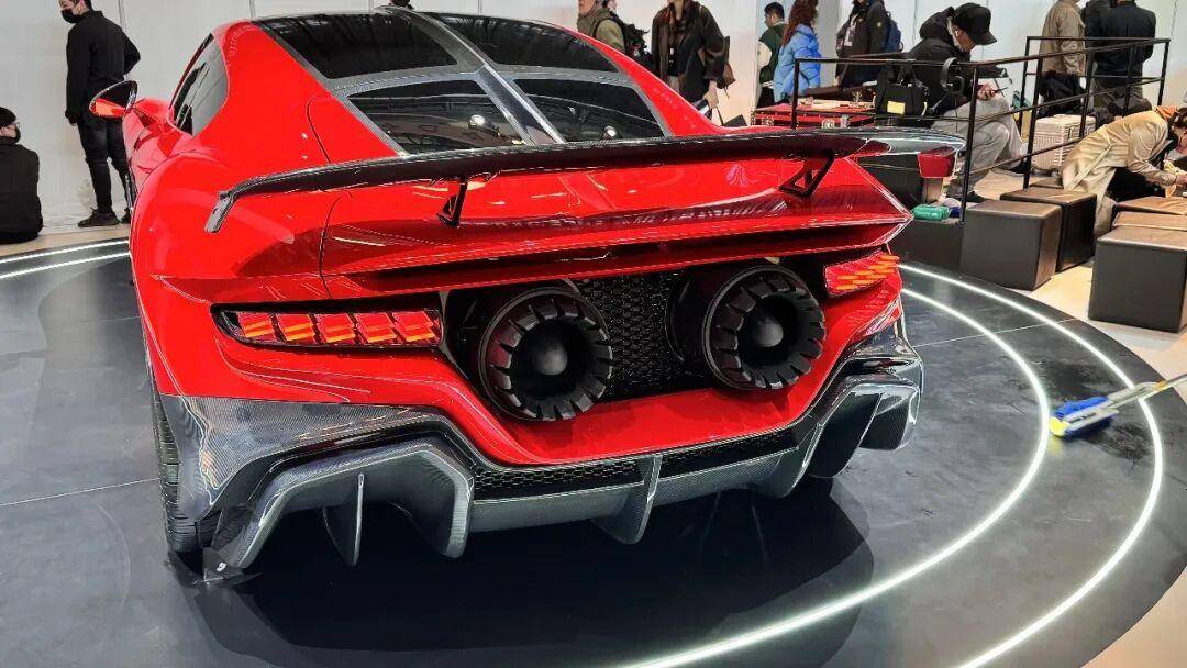 车灯采用L形的造型,有点法拉利488和玛莎拉蒂MC20的影子。前唇则是由碳纤维材质打造,搭配上两侧大尺寸的竖向风刃,说实话,这套前脸放在任何一台超跑上都不维和。