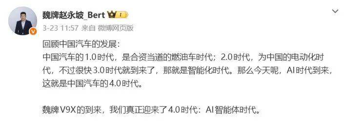 魏牌CEO赵永坡说,中国汽车进入了4.0时代。