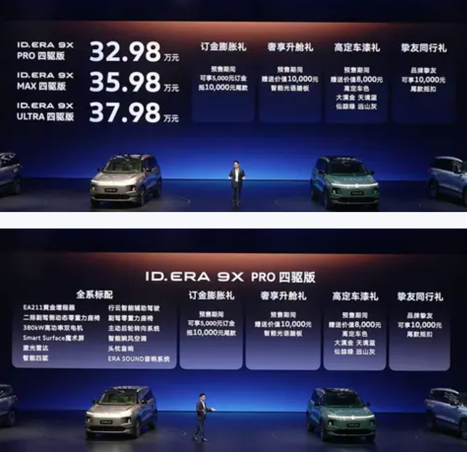 眼看着国产各种各样的车企,依靠大6座的大型SUV赚得盆满钵满,甚至已经重新定义了大型SUV。有些合资车企自然坐不住了,因为他们是有追求的,愿意学习先进经验,这就是上汽大众的ID.ERA 9X车型,在最近正式开启了预售,预售价格32.98万到37.98万,这当然不是一个便宜的价格,甚至比过去大众在国内销售的几乎所有SUV都要贵。但要是和行业主流的9系列车型去比,这个价格打眼一看还是挺合适的,那么ID.ERA 9X它能否成功呢?