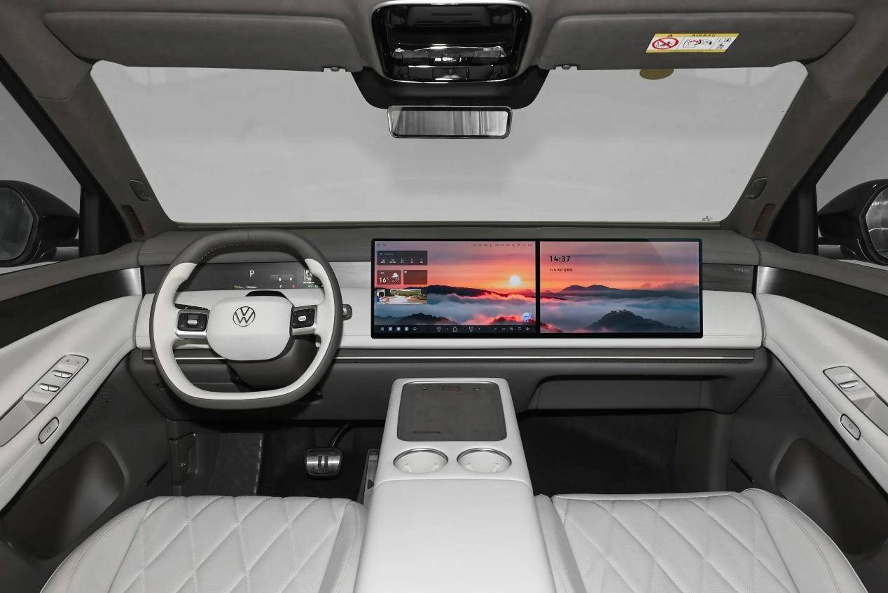 内饰设计就更加离谱了,还是那句话,盖上它的标志看起来和国内的很多车型都很相似。上下平底的方向盘设计,而且还是双辐式结构,小的液晶仪表再加上两个连在一起的前排屏幕,国产味道太浓了,为了节省中控位置的空间,电子排档没有缺失,后排也是两个独立的座位,两段式的全景天窗,中间还有一个可以翻折的吸顶屏幕,很难相信这是大众集团设计出来的产品。