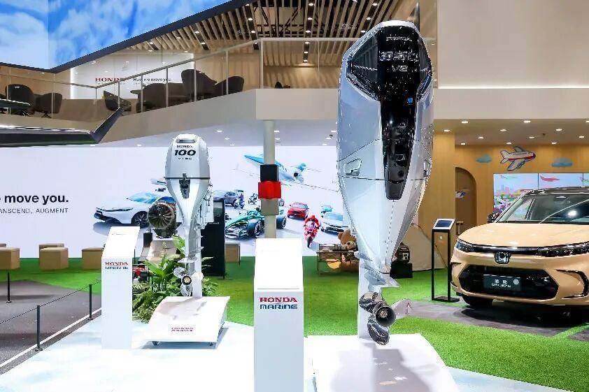 通用动力产品方面,Honda展示BF350A、BF100A、BF10DK2三款船外机,以及变频发电机、草坪机、水泵、通用发动机等,覆盖渔业、农业、工业及家用场景。截至2025年12月,Honda通用动力产品在华累计销量超1000万台。